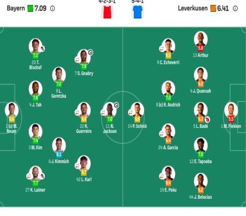 勒沃库森首发:1-弗莱肯、4-宽萨、5-巴代、12-塔普索巴、13-阿图尔、44-贝洛西安(85’17-本·塞吉尔)、24-阿莱克斯·加西亚(46’30-马扎)、8-安德里希、19-波库(56’11-泰里耶)、9-埃切维里(35-科法内)、14-希克(56’7-霍夫曼)。