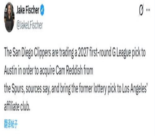 另据名记Fischer报道,雷迪什被马刺的发展联盟附属球队奥斯汀马刺认领。随后,奥斯汀马刺把雷迪什交易至圣迭戈快船(快船发展联盟附属球队),换取2027年发展联盟选秀大会的一个首轮签。