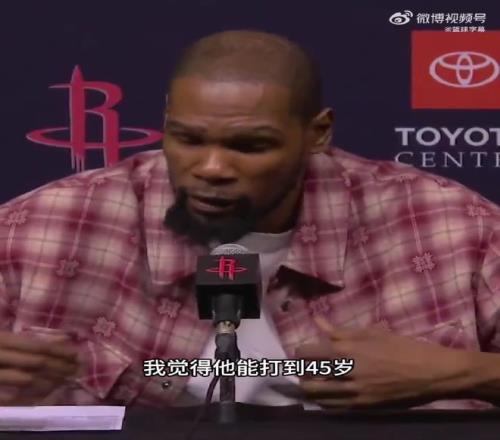 赛后采访时,火箭队当家球星杜兰特表示,“我觉得他能打到45岁,我不知道他想不想打这么久,但说实话,我认为他还能再战个四五年。这已经不足为奇了,虽然他已经41岁,但是在场上的状态依然好的离谱。当你像他一样热爱这项运动,你会竭尽全力保持专注,维持巅峰水准,他整个人都非常励志!”
