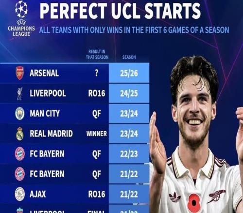 过往欧冠14次出现单赛季前6战全胜球队,最终仅2队夺冠 -